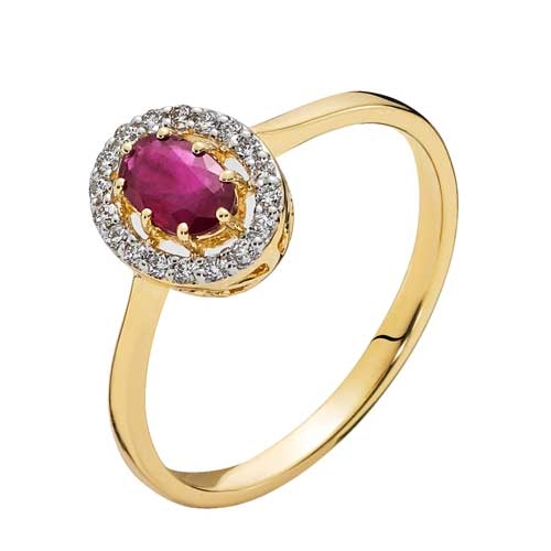 Denne ring er fremstillet i 14 kt. Guld og prydet med en smuk oval rubin og 18 brilliantslebne diamanter på i alt 0.11 ct.